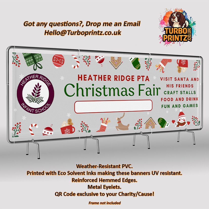 Festive, fully customisable vinyl banner for Holy Family Primary School’s Christmas Fayre. Features bright winter graphics, school logo, and space for your event details. Frame not included.